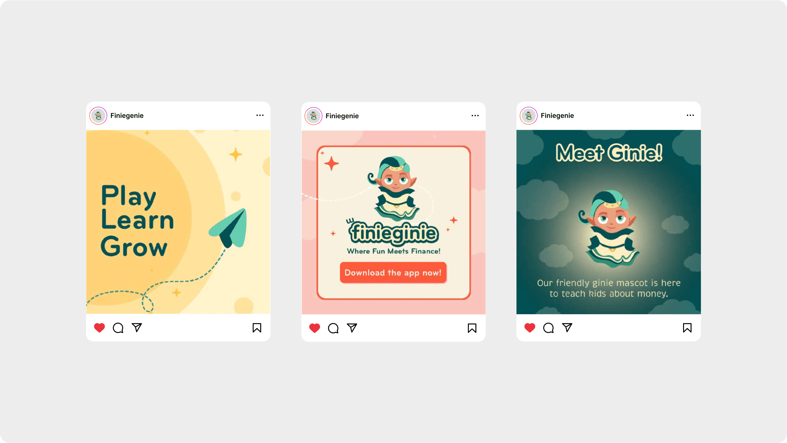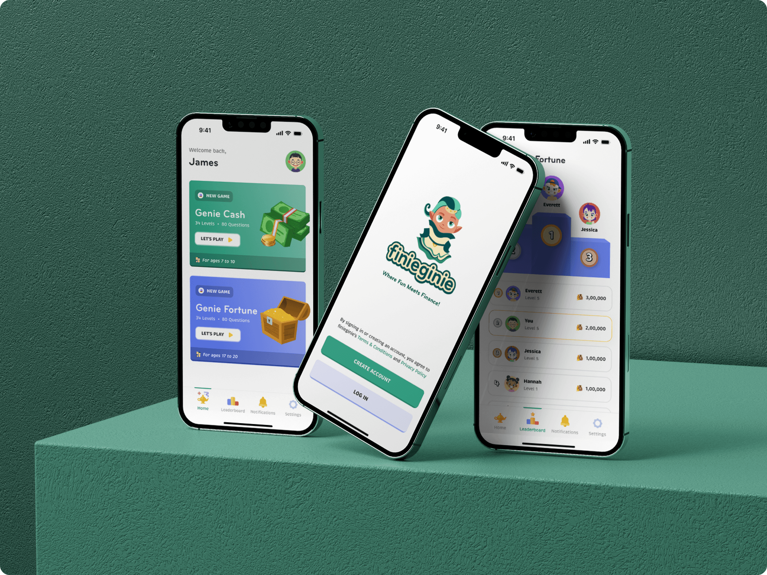 With the vibrant and playful nature of the Finiegenie character in mind, we decided on a minimalistic branding approach. The app features a bright and engaging color palette, reflecting its game-based learning environment. To complement the lively visuals, we chose a friendly, happy typeface that appeals to children. The branding strikes a perfect balance between fun and educational, making Finiegenie both inviting and effective in its mission to teach kids about finance.